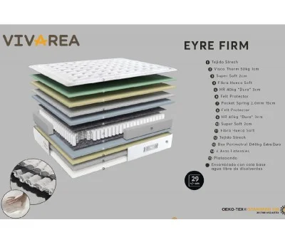 El colchón Eyre Firm destaca por su alta firmeza y resistencia, sin perder el confort gracias a una capa de viscoelástica de 50kg más otra cada de fibra super blanda, que combinan a la perfección con una goma dura de 40kgs y el núcleo de muelle ensacado con muelles de 15 centímetros.