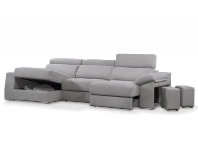 Chaise longue arcón, brazo siesta con dos puff integrados, cabezales abatibles y asientos deslizantes con apoyo frontal.