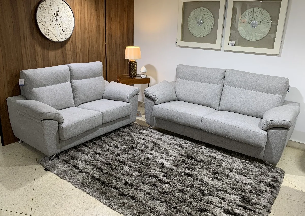 Conjunto 3+2 con diseño moderno y pata metálica. Disponible en diferentes tapicerías con tratamiento de fácil limpieza.
